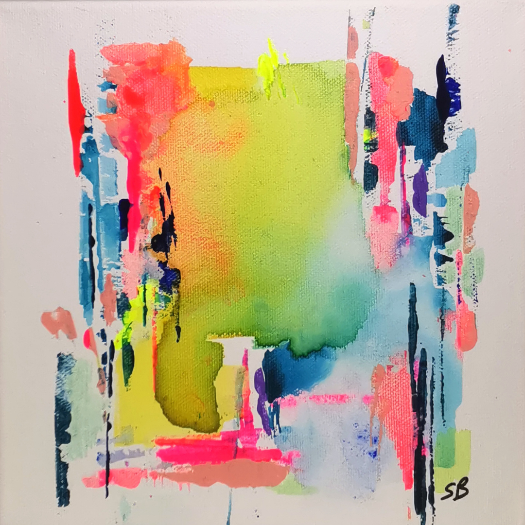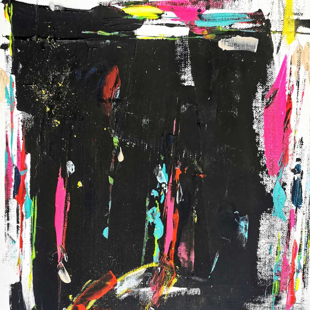 Sur papier, l’acrylique s’exprime avec spontanéité : aplats, contrastes, transparences et éclats fluorescents composent un langage visuel vivant. Néons explore la lumière urbaine et la pulsation intérieure. Entre structure et chaos, chaque œuvre capte un instant d’intensité — une vibration, un rythme, une émotion.