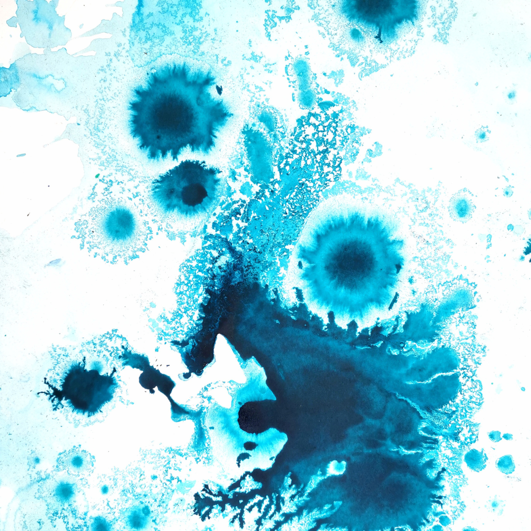 Sur papier, l’encre se déploie librement, créant des formes organiques, des textures imprévisibles et des nuances profondes de bleu. Chaque œuvre capture un instant de rencontre entre l’eau et la matière — un équilibre fragile entre contrôle et lâcher-prise.