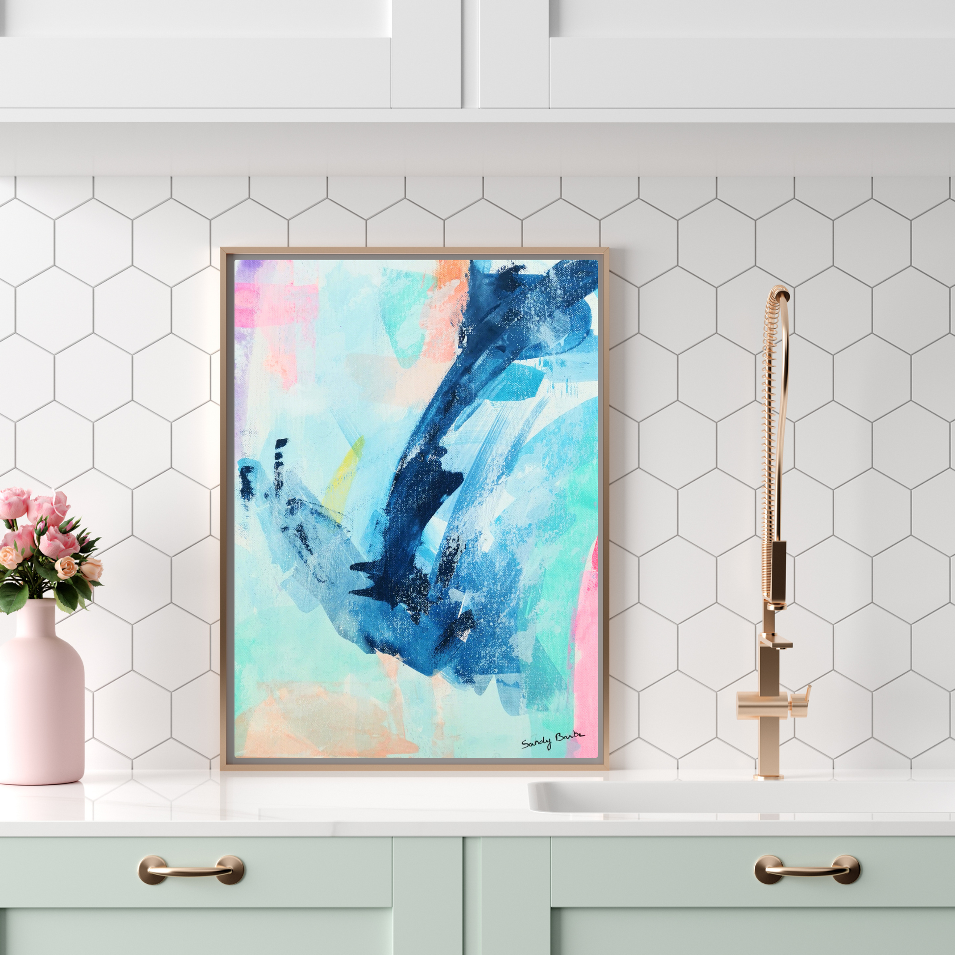 Entre bleu profond et turquoise éclatant, la toile évoque le jaillissement de l’eau, la fraîcheur d’une vague et l’élan vital d’un plongeon dans l’océan.
